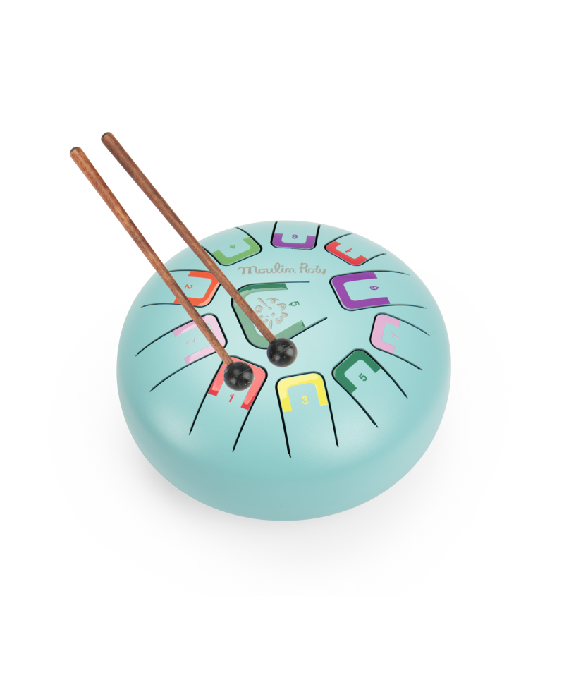 D'un diamètre de 20 cm, le petit tambour à languettes se joue avec les doigts, les mains ou les baguettes fournies. Composé de 11 notes, il est le parfait instrument pour favoriser l'éveil musical. Contient un livret de partitions et un sac en tissu.