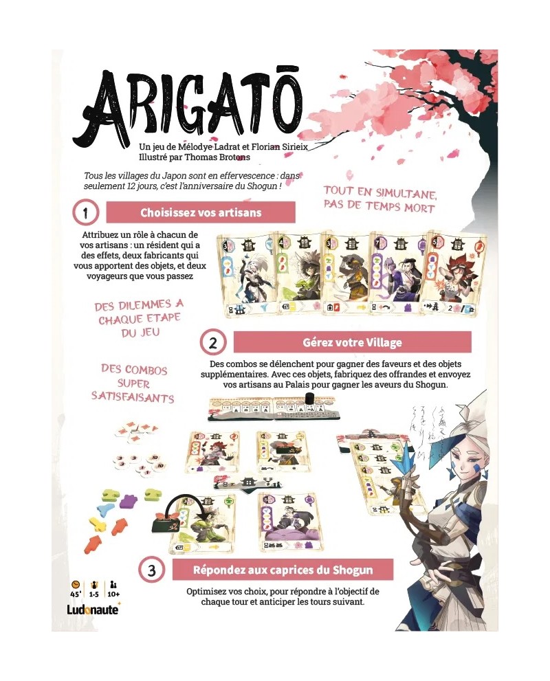 Dans Arigato, vous incarnez la personne en charge de votre Village. Dans 12 jours, c'est l'anniversaire du Shogun et votre objectif est de gagner ses faveurs. Pour cela, vous allez lui ...