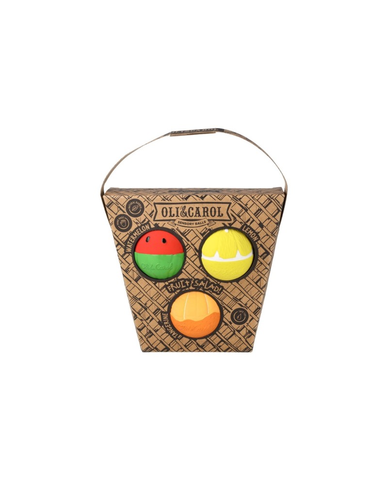 Colorées et juteuses ! Le set Salade de Fruits inclut trois mini balles sensorielles : une pastèque rafraîchissante (notre best-seller), un citron acidulé et une mandarine sucrée.