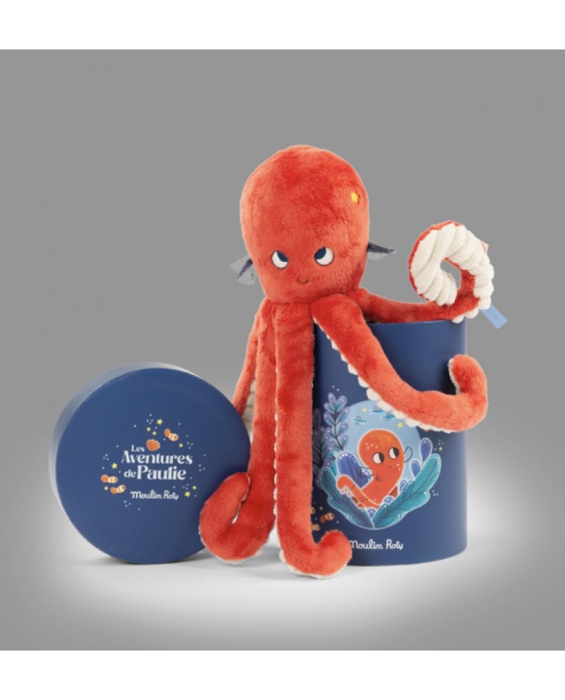 Poupée Paulie le poulpe, le compagnon idéal pour plonger dans un océan de doux et tendres câlins. Elle flotte au creux de l'océan dans une jolie boîte toute en rondeur.