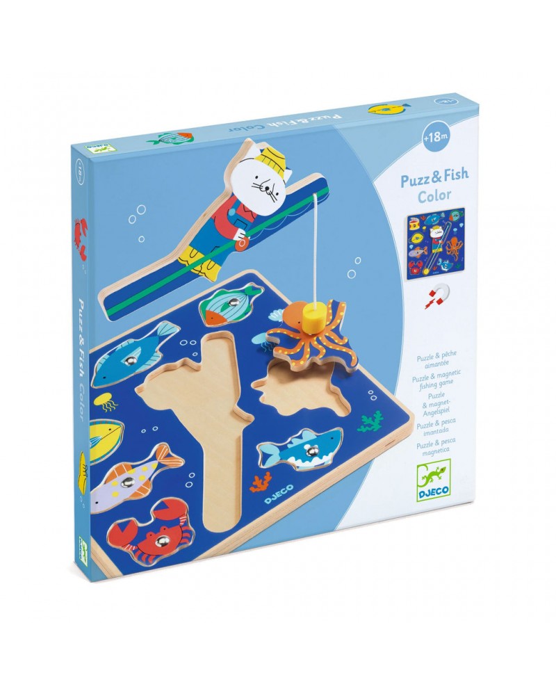 Puzz & Fish combine un puzzle en bois avec un jeu de pêche amusant. Le chat pêcheur tient une canne aimantée qui permet à l’enfant d’attraper les poissons colorés. Une fois la pêche terminée, il replace les poissons sur le socle pour recommencer l’aventure. Un jeu qui développe la coordination et la patience tout en apportant beaucoup de plaisir !