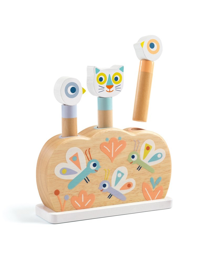 Un jouet pop-up en bois naturel et aux couleurs pastel, destiné aux tout-petits dès 12 mois.