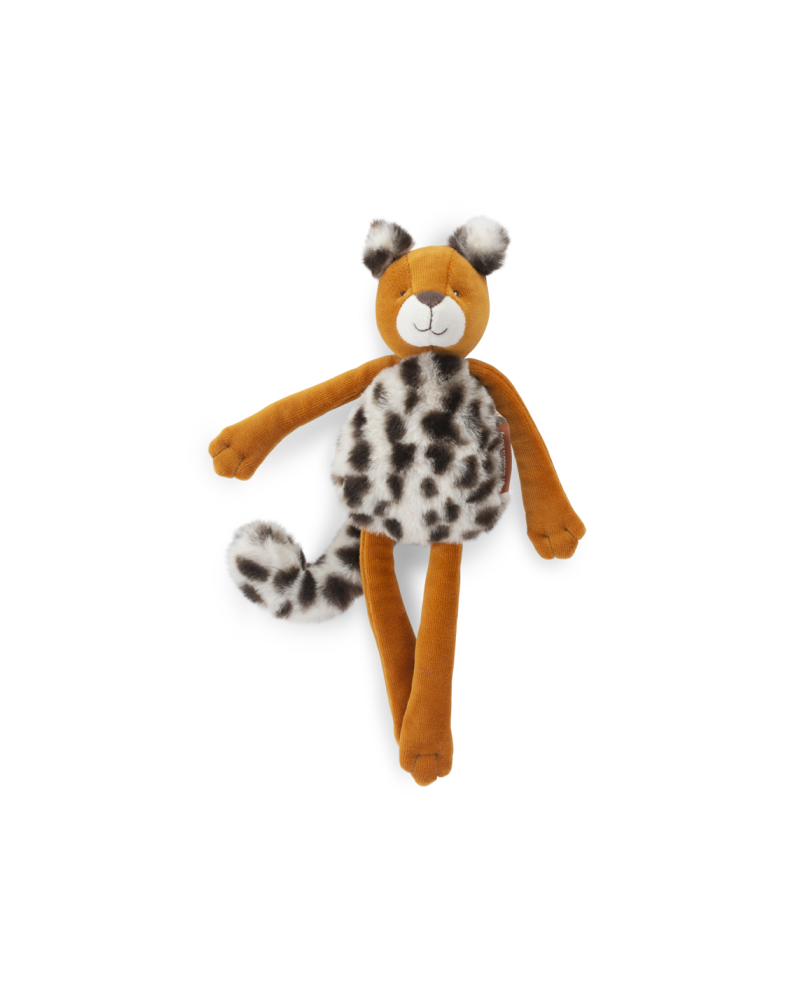 Hochet léopard Taïgo avec ses longues pattes faciles à attraper et son corps tout doux à câliner.