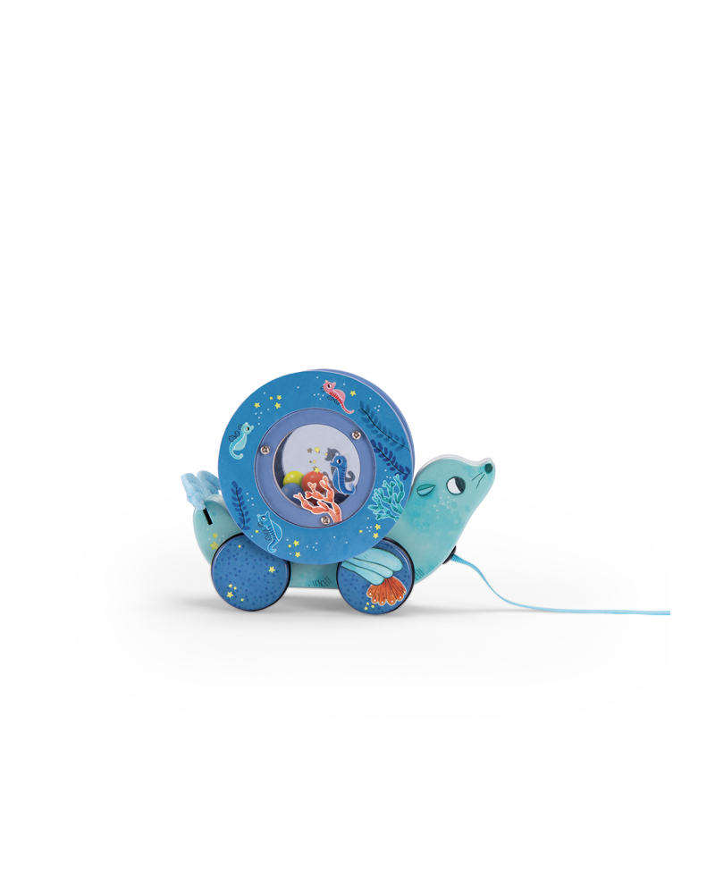 Otarie à tirer en bois qui accompagnera bébé dans son éveil aux sons et au toucher.