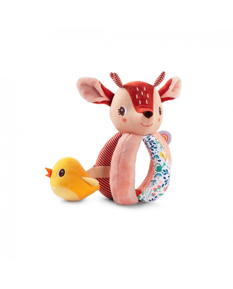 Stella et son ami l'oiseau sont inséparables ! Avec ce gros hochet à poignées, bébé s'éveille en douceur dès l'âge de 6 mois. Pour cela, il dispose de 4 activités sensorielles pour se divertir en bonne compagnie. D'abord, un hochet à faire tinter encore et encore dans la tête de Stella le faon, idéal pour éveiller votre tout-petit aux sons. Ensuite, les cinq poignées qui composent le jouet proposent différentes matières et motifs qui stimuleront la vue et le toucher. Il y a même du papier bruissant à faire crépiter dans la poignée rose ! Enfin, un second hochet se cache dans le petit oiseau. Pour le saisir, il faudra plonger sa main dans le corps de Stella et se frayer un chemin entre les poignées ! Vous l'aurez compris, ce jouet d'activités permet à bébé de développer son acuité visuelle et auditive, mais aussi sa motricité. Dans son format 18 x 15 x 19 cm, il se présente telle une balle d'activités en peluche toute douce. Très agréable à parcourir et à câliner, on peut faire rouler ce jouet d'éveil Lilliputiens et plonger ses mains à l'intérieur pour l'explorer davantage. La taille et la forme des poignées ont été pensées pour s'adapter aux petites mains de bébé. Composé de polyester, dont recyclé pour le rembourrage, ce hochet à poignées Stella est lavable en machine à 30°. C'est un cadeau de naissance idéal pour offrir ses premiers copains tout doux à bébé, et éveiller sa curiosité.