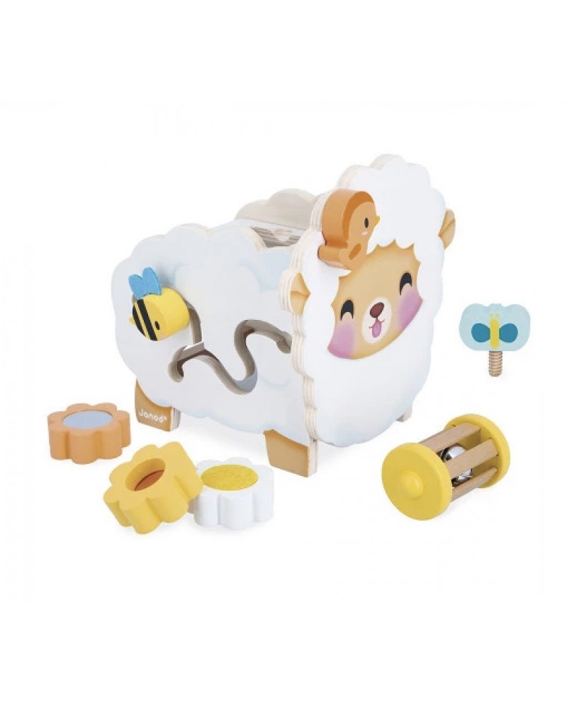 Qu'il est mignon ce mouton en bois à l'allure champêtre ! Fleurs, abeille, papillon… toute la nature est au rendez-vous ! Ce mouton multi-activités propose de nombreux jeux qui vont plaire aux enfants dès 12 mois.