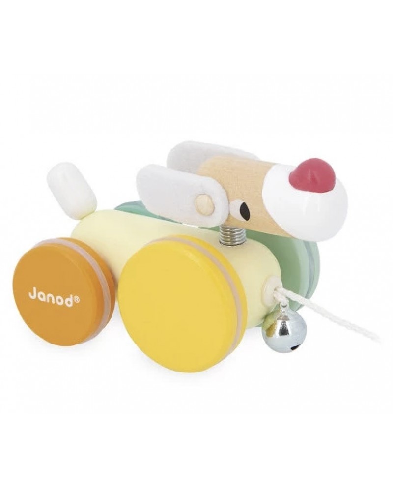 C'est l'heure de la promenade ! Ce petit chien en bois coloré ne demande qu'à être adopté ! Il va vite devenir le compagnon préféré des tout-petits, toujours prêt pour une balade dans la maison ou une expédition dans le jardin. Avec sa tête sur ressort, son museau rouge rigolo et sa clochette qui tinte dès qu’on le fait rouler, il est LE compagnon idéal pour les premières balades de bébé. L’enfant le tire derrière lui et l’emmène partout avec lui ! La queue en élastique invite les petites mains à la tirer et la relâcher : un petit geste qui amuse et intrigue ! Et ses oreilles ? Elles sont en feutrine et on peut les tourner, pour lui créer une expression unique à chaque promenade. Pour plus de confort, les roues sont silencieuses grâce au caoutchouc antidérapant. Ce jouet en bois, conçu pour les enfants dès 1 an, encourage la marche et développe la motricité globale. Il est issu de la gamme Zigolos : une collection joyeuse et colorée, aux formes ludiques, pour éveiller les sens et accompagner les tout-petits dans leurs premières découvertes. Ce jouet d'éveil est fabriqué avec du bois certifié FSC™ et de la peinture à l'eau. Longueur de la ficelle : 50 cm.