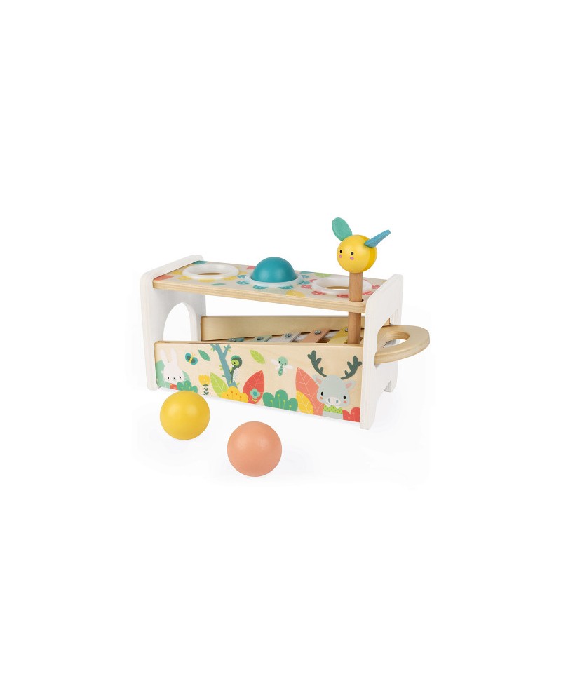 Le Tap tap xylo Pure est un jeu 2 en 1: un marteau abeille pour frapper les 3 balles qui tombent en faisant tinter les touches du xylophone, lui-même amovible pour pouvoir jouer partout ! Votre enfant va pouvoir appréhender les couleurs en déposant chaque balle sur le trou de la bonne couleur. Il va éveiller ses sens, imaginer et créer ses premières histoires.