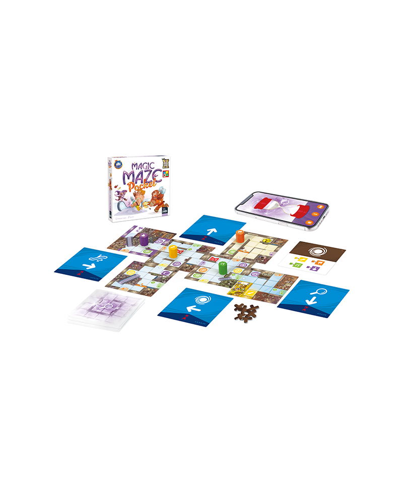 Cette version compacte condense l’essence de l’expérience Magic Maze, offrant la même tension coopérative et le défi en temps réel dans un format accessible et rapide à jouer. Toujours sans communication libre, chaque joueur peut, à tout moment, déplacer n’importe lequel des 4 Héros, mais uniquement selon une action spécifique qui lui est attribuée : avancer vers le nord, explorer une nouvelle zone, emprunter un escalator… Cette contrainte impose une coordination rigoureuse et intuitive pour atteindre l’objectif avant que le sablier virtuel ne s’écoule.