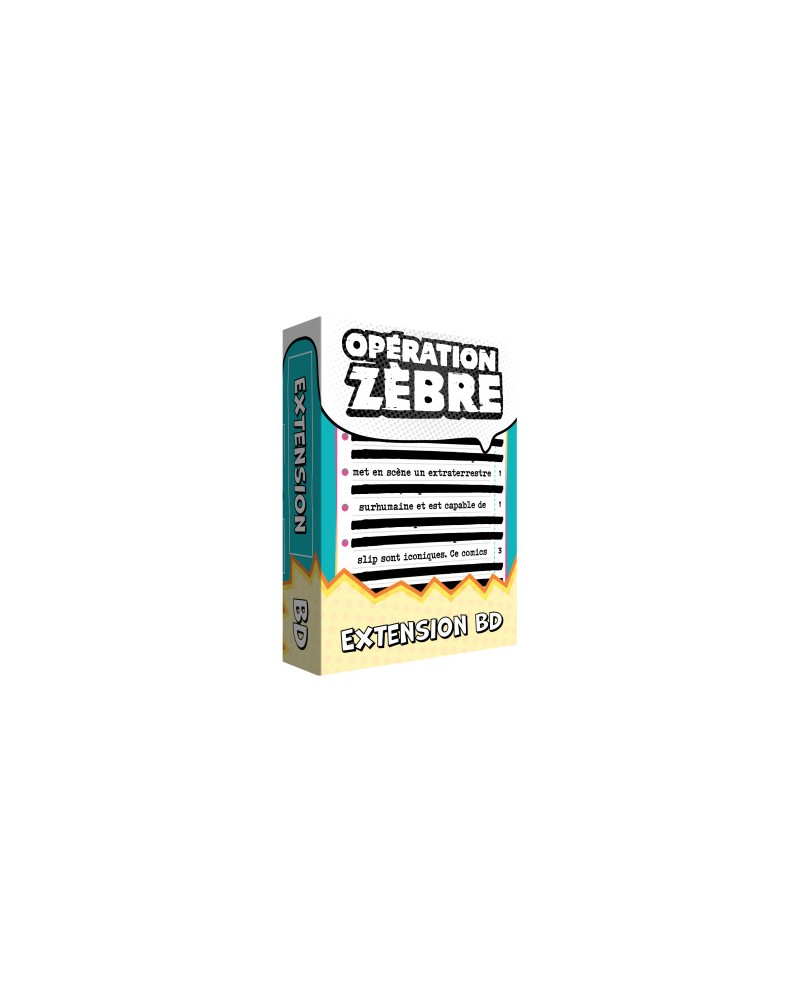 Opération Zèbre propulse votre équipe d’agents secrets dans une nouvelle dimension de jeu de déduction et de communication ! Votre mission : transmettre des documents classifiés sur des villes, séries, célébrités… et maintenant la Bande dessinée, en donnant juste assez d’indices pour que vos coéquipiers devinent correctement, tout en censurant vos informations pour compliquer la tâche. Opération zèbre extension BD apporte 55 cartes recto-verso, soit 110 nouvelles cartes à deviner, enrichissant le jeu de base avec des thématiques ludiques et variées dont celui de la BD. Chaque manche devient un véritable défi où créativité, stratégie et esprit d’équipe sont indispensables pour dominer la partie.