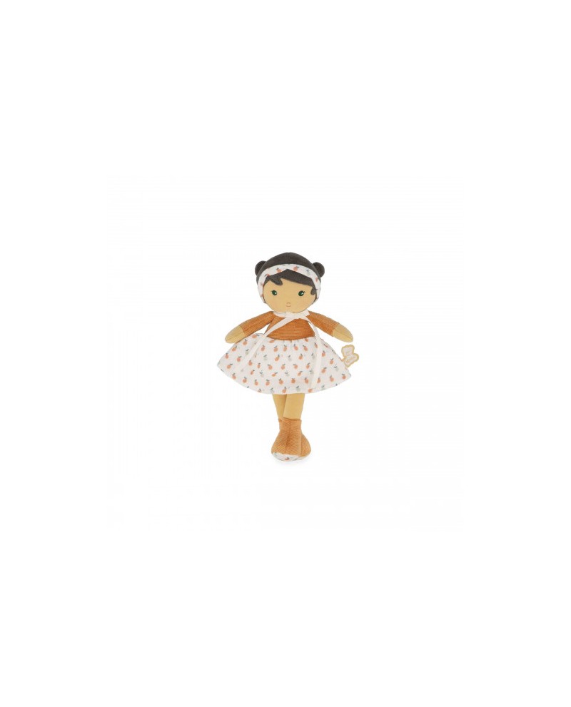 Elle nous emmène dans un univers tendre et bucolique, fait de promenades à la campagne et de rêveries au pied des pommiers. La poupée Éloïse porte un joli haut à rayures, lui apportant une touche d'élégance. À ses pieds, des petites bottines assorties à sa tenue lui permettent de se balader confortablement sous le soleil ! La poupée Éloïse porte également une sublime jupe en velours côtelé et mousseline parée de motifs fruités, rappelant la douceur des beaux jours et les plaisirs des récoltes sous le soleil. Un délicat bandeau, assorti à sa jupe, vient souligner ses doubles chignons, renforçant son allure joyeuse et pétillante ! D’une grande douceur, elle est parfaite à saisir et à câliner par les plus petits. Facile à emporter partout, Éloïse accompagne les enfants dans leurs plus tendres aventures.