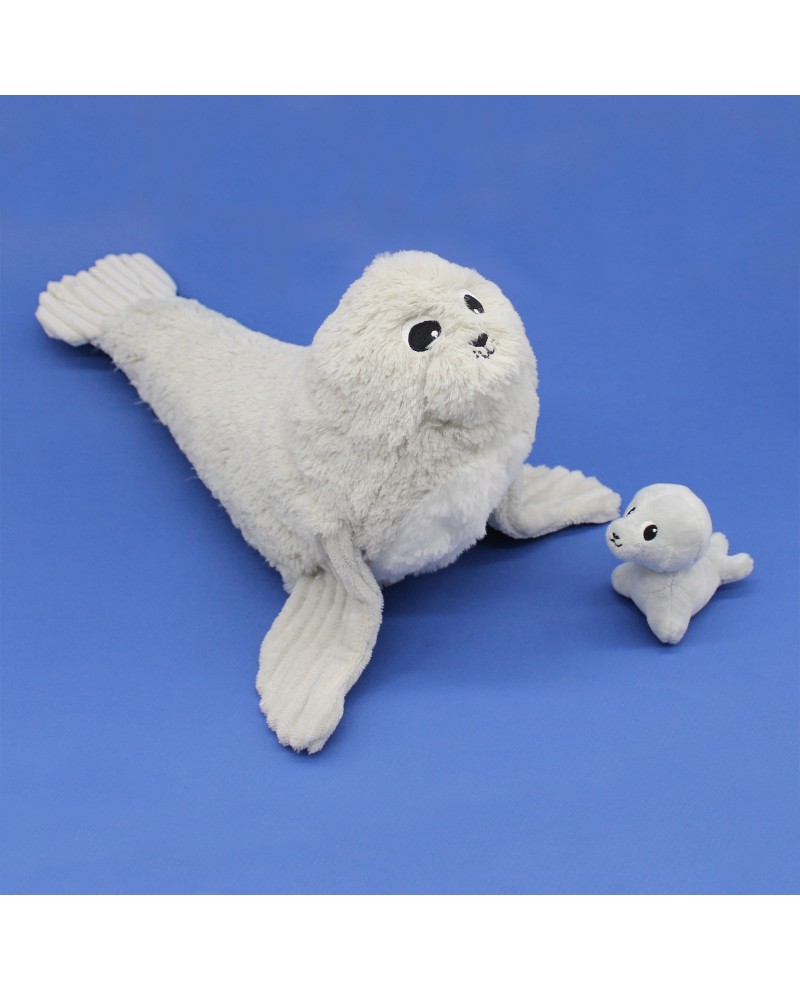 Cette otarie couleur blanc et gris clair de 35 cm est en velours côtelé et soft tout doux. Et pour plus de câlinou, un bébé otarie se cache dans son ventre.