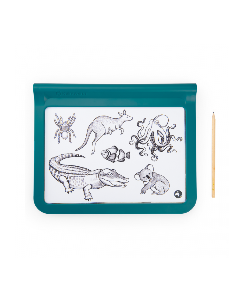 Nomade et lumineuse, la tablette MOULIN ROTY x Kidywolf invite à dessiner partout ! Au recto, on décalque les animaux de la collection Tout autour du monde ; au verso, on y dessine au feutre fluo pour un effet néon magique