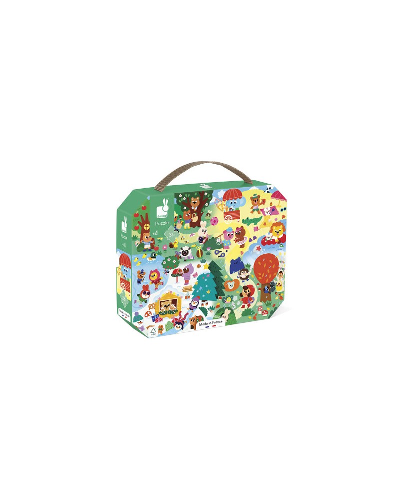 Les saisons rythment la vie des animaux ! Avec ce puzzle de 36 pièces sur le thème des 4 saisons, les enfants, à partir de 4 ans, découvrent l'évolution de la nature. Pièce par pièce, l'enfant construit le puzzle et découvre chaque détail du quotidien des animaux au fil des saisons ! En hiver, les manchots s'amusent à glisser sur la neige... réveillant l'écureil qui se protège du froid ! Au printemps, le lapin et le mouton se sont lancés dans une chasse aux oeufs. C'est à celui qui en aura le plus ! Et en été ? On dirait bien que la souris construit son plus beau château de sable ! Idéal pour apprendre les spécifités de chaque saison, ce puzzle aide les enfants à développer leur concentration et leur motricité fine. Il est fabriqué en France à partir de carton certifié FSC™ et s'emporte partout grâce à sa jolie valisette. À base d'encres végétales.